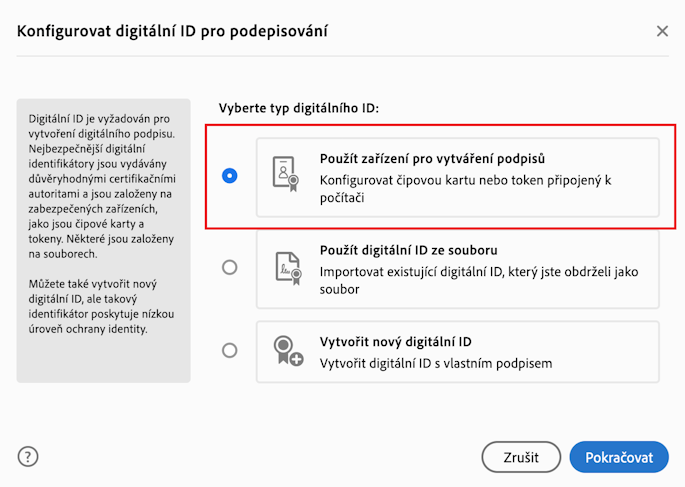 Poté zvolte první možnost Použít zařízení pro vytváření podpisu a klikněte na Pokračovat